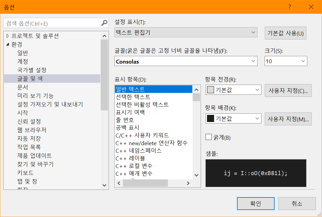 "환경" 항목의 "글꼴 및 색" 파트를 선택합니다.