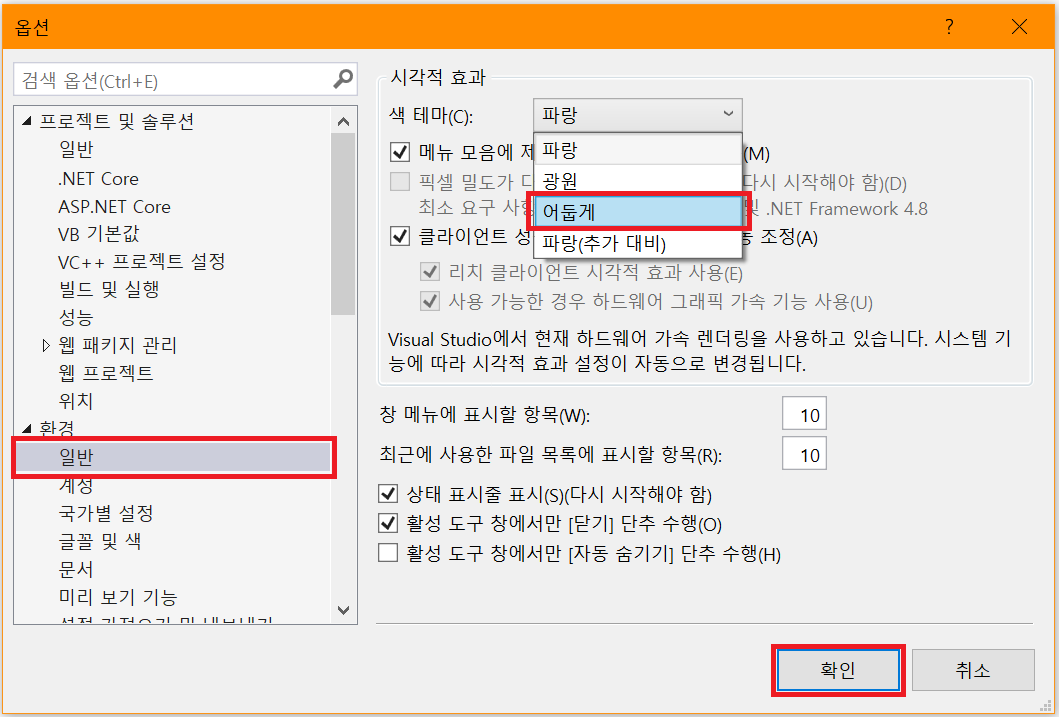 "환경" 파트의 "일반" 부분을 누르시고, 색 테마 파트를 "어둡게"로 지정합니다.