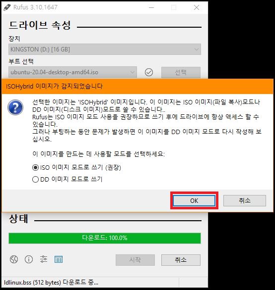 ISO 이미지 모드로 쓰기를 선택한 뒤, 'OK'를 눌러줍니다.