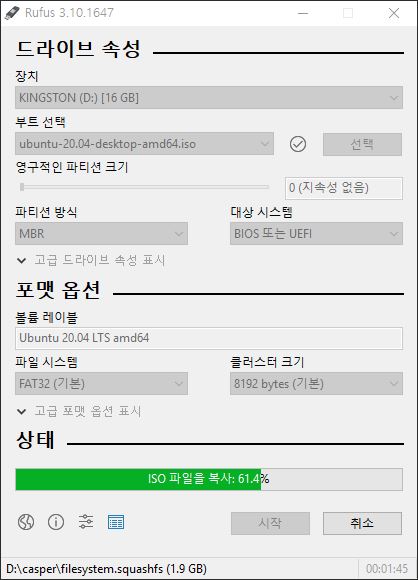 필요 프로그램 : rufus-3.10.exe , ubuntu-20.04-desktop-amd64.iso