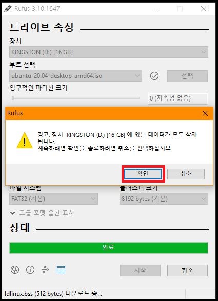 USB에 있는 데이터가 모두 삭제됩니다. '확인' 버튼을 누르기 전