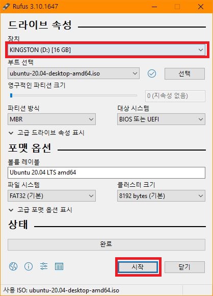 장치 부분에 부팅 USB로 만들 USB를 선택하고, 시작 버튼을 누릅니다.