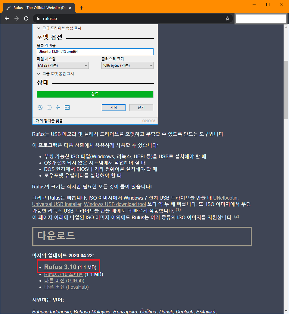 위의 사이트에서 최신 버전의 Rufus 프로그램을 다운로드합니다.