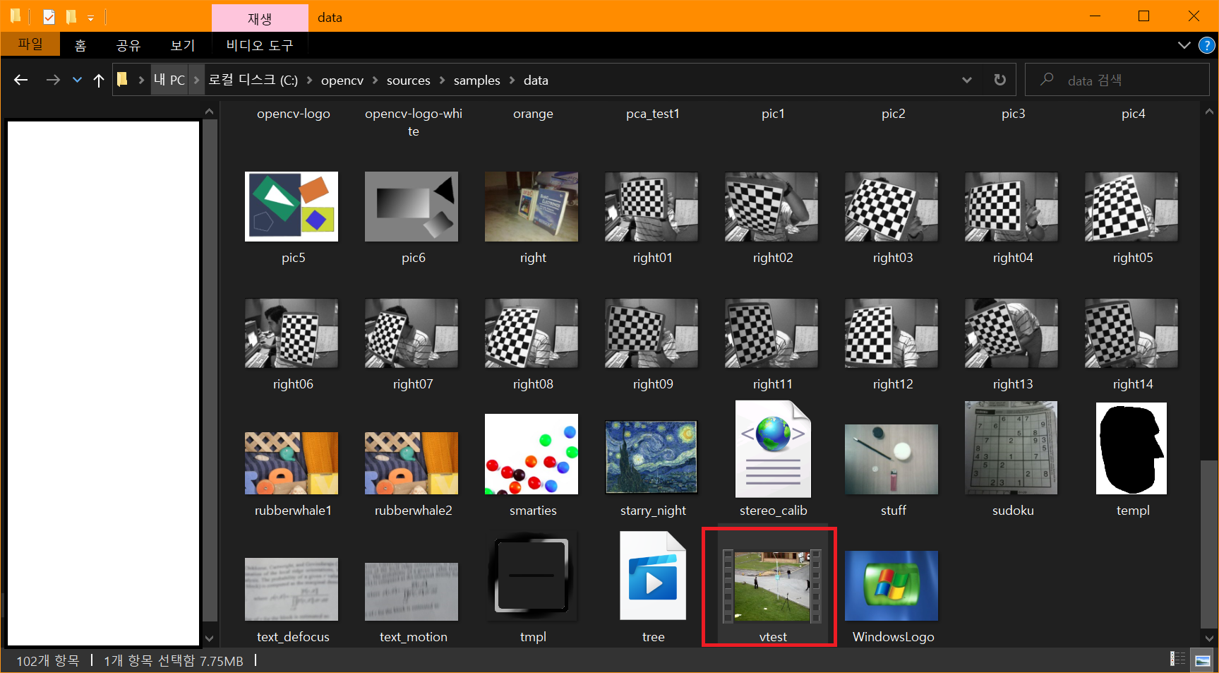 C폴더에 OpenCV를 설치하였을 경우의 디렉터리 위치는 C:\opencv\sources\samples\data 입니다.