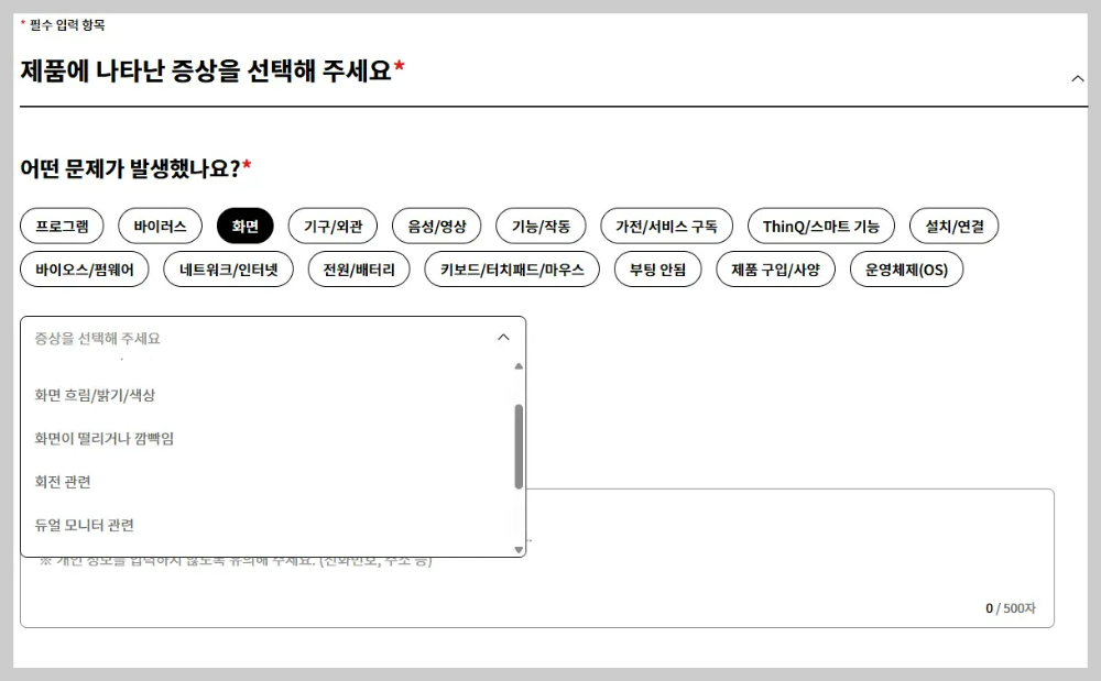 제품 수리에 도움이 될만한 상세 정보를 입력합니다. 서비스 센터에서 모든 부품을 제고로 보유한 상태가 아닐 수 있기 때문에, 증상 입력은 빠른 수리에 도움이 될 수 있습니다.