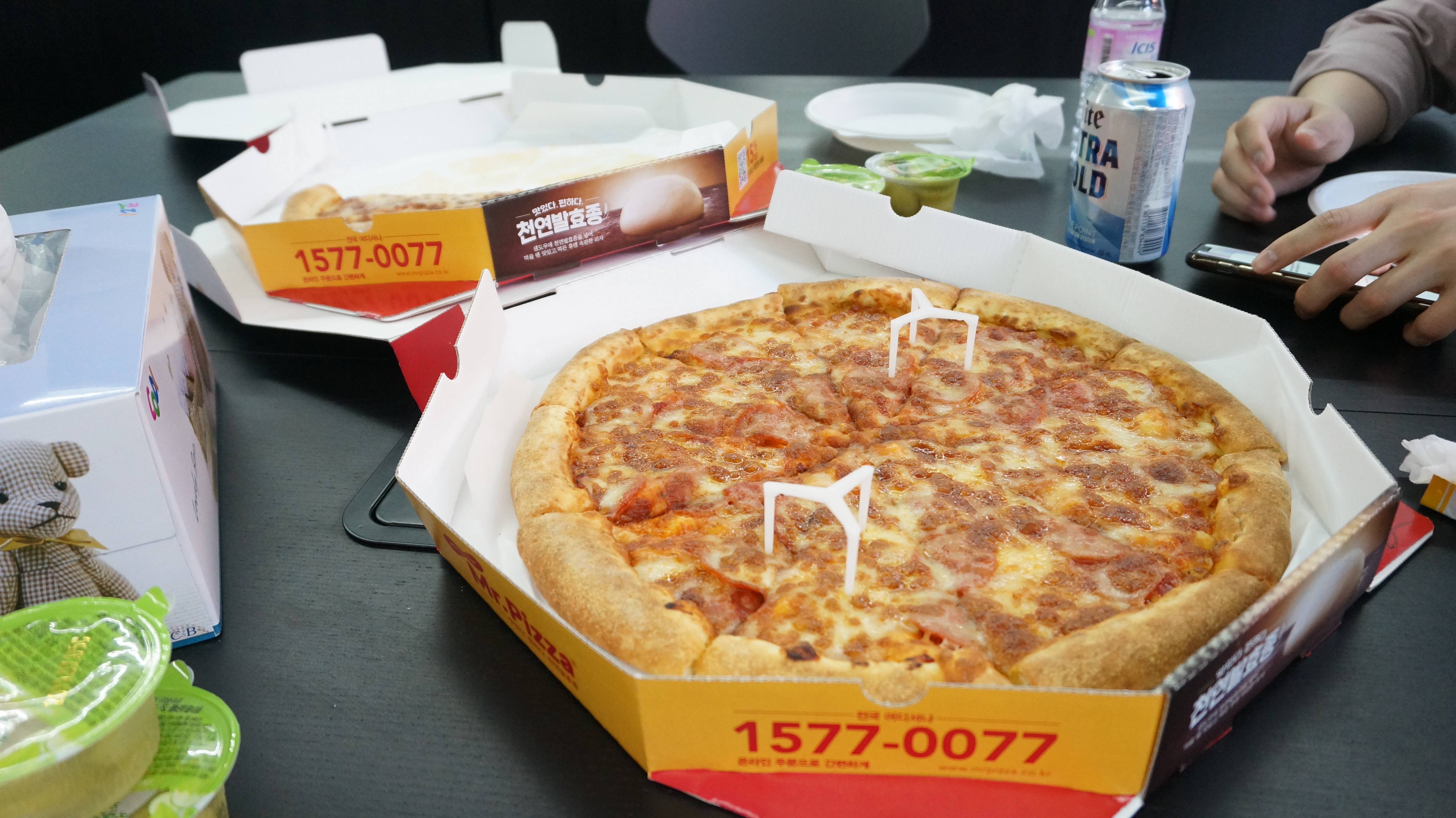저녁 식사로 피자와 음료수&맥주를 먹으며